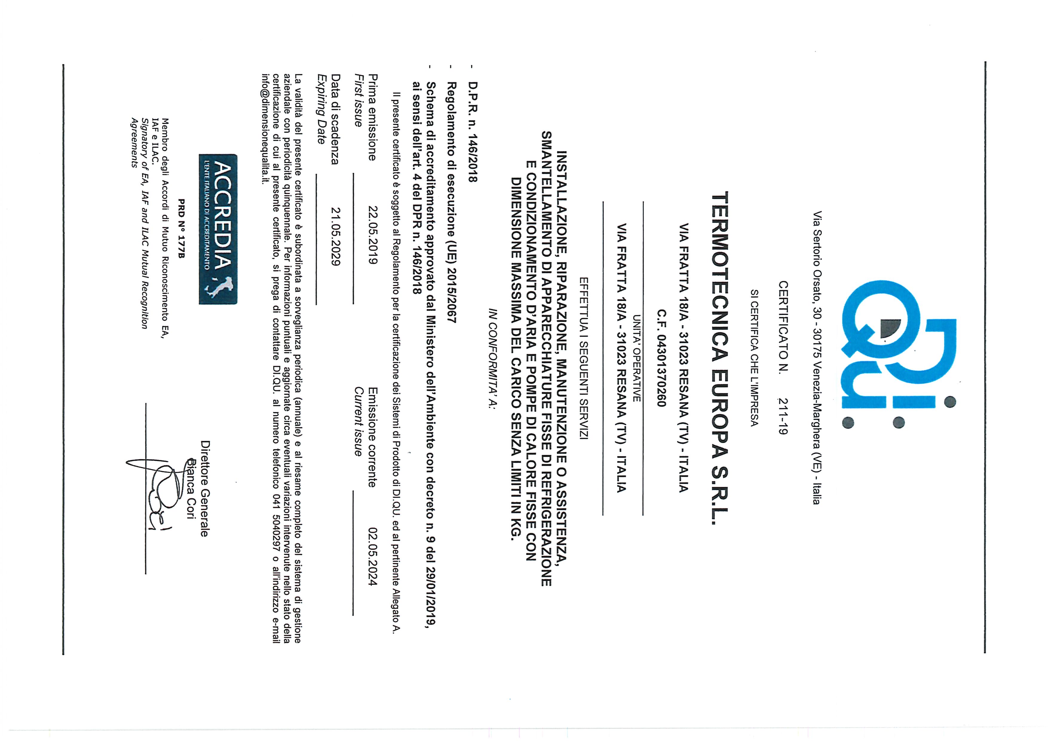CERTIFICAZIONI CERTIFICAZIONE SISTEMA DI QUALITA’ UNI EN ISO 9001:2015 La TERMOTECNICA EUROPA SRL opera con il Sistema Certificato di Qualità UNI EN ISO 9001:2015 L’azienda è costantemente impegnata a perseguireUna qualità non solo documentale ma una qualità vera che permette e garantisce la tracciabilità e il monitoraggio di tutti i processi interni ed esterni dell'azienda. C ERTIFICAZIONE SISTEMA DI GESTIONE SICUREZZA E SALUTE DEI LAVORATORI UNI ISO 45001:2018 E' stato adottato il piano di sicurezza sul lavoro allo scopo di precisare le regole e tutti gli elementi utili in materia di sicurezza e di salute, applicabili al cantiere interessato, conformemente alle disposizioni contenute nel Testo Unico, riguardanti il miglioramento della sicurezza e della salute dei lavoratori sul luogo di lavoro", in conformità alla normativa vigente in materia di prevenzione degli infortuni ed igiene del lavoro e riguardante le prescrizioni minime di sicurezza e di salute da attuare nei cantieri temporanei e mobili. CERTIFICAZIONE SISTEMA DI GESTIONE AMBIENTALE UNI EN ISO 14001:2015 Il sistema di Gestione Ambientale consente di un'organizzazione e di perseguire obiettivi ed attuare politiche che tengano conto delle prescrizioni legali e delle informazioni riguardanti gli aspetti ambientali significativi. Nello specifico, lo sviluppo di un Sistema di Gestione Ambientale, certificato secondo la norma UNI EN ISO 14001, consente di gestire in modo sistemico gli aspetti ambientali inerenti ai processi, in ottica di efficienza e miglioramento delle performance ambientali. CERTIFICAZIONE F – GAS Nel rispetto dei protocolli internazionali sui cambiamenti climatici (Protocollo di Montreal e Protocollo di Kyoto), la Termotecnica Europa si è impegnata attivamente a ridurre le emissioni delle sostanze lesive per lo strato di ozono e delle sostanze che contribuiscono all’effetto serra. Dal 2019 la Termotecnica Europa Srl è in possesso della certificazione F-Gas. SOA ATTESTAZIONE DI QUALIFICAZIONE ALLA ESECUZIONE DI LAVORI PUBBLICI Termotecnica Europa è in possesso della certificazione SOA che attesta la qualificazione per la partecipazione a gare d’appalto per l’esecuzione di appalti pubblici di lavori nelle seguenti categorie CATEGORIA OG 11 - CLASSIFICA II CATEGORIA OS 28 - CALSSIFICA IV MePA Termotecnica Europa è accreditata come fornitore di beni e servizi in rete per le PA. |